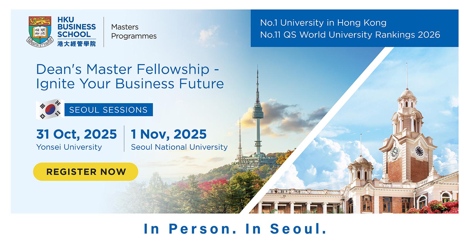 ๐ค Let’s keep the momentum going - our HKU Business School Masters Programmes Information Session is coming to its 11th stop – Seoul! From this October to early November, our Admissions Director will be holding two information sessions in Seoul for Korean bachelor students on the following topics: