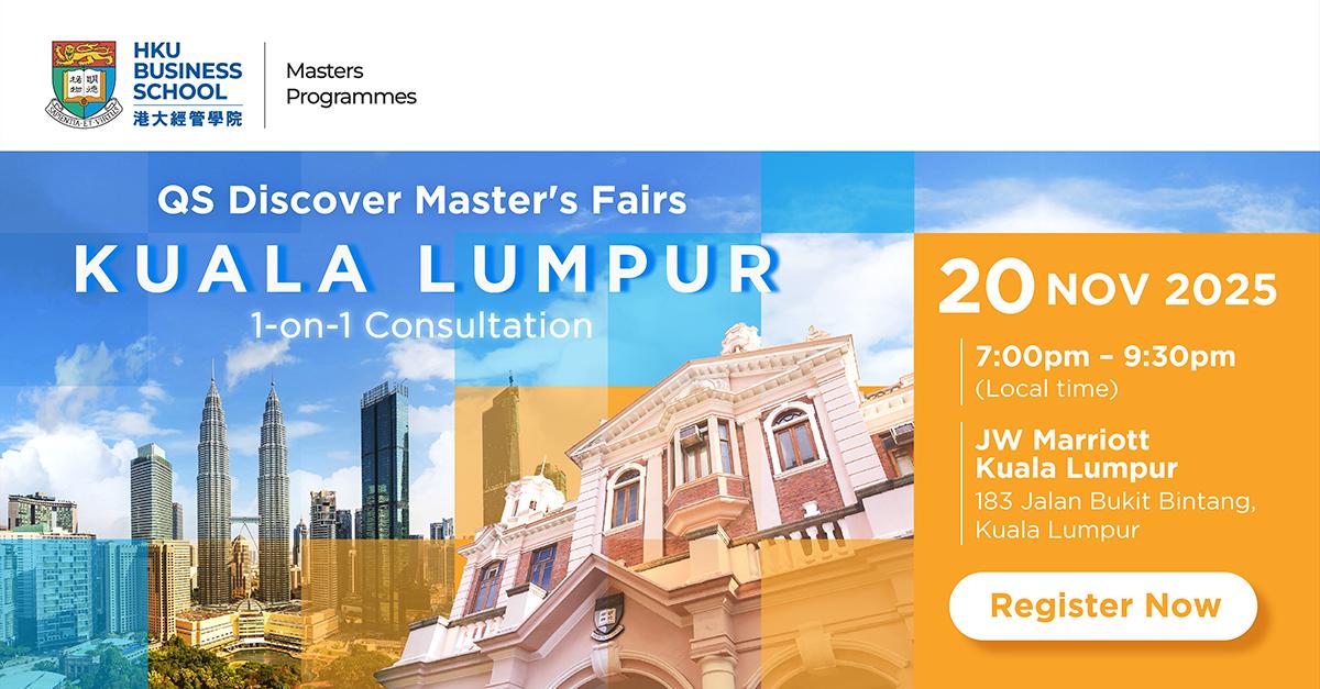 📢 This October, the HKU Business School’s Masters Programmes Admission Team will be in Kuala Lumpur for the QS Discover Masters Fair! We’re excited to meet students in Kuala Lumpur face-to-face and introduce Masters Programmes and the abundant student service resources in detail. We will also provide 1-on-1 consultations for personalised application and career advice. Don’t miss out, join now!