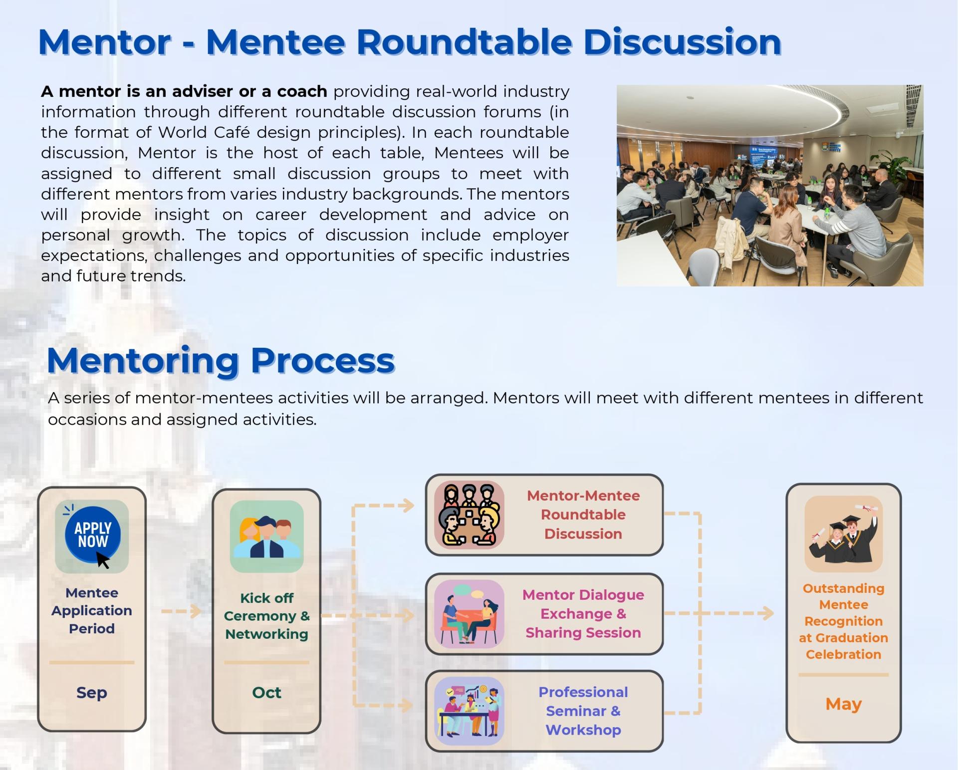 An Executive Mentor is an adviser or a coach providing real-world industry information through different roundtable discussion forums (in the format of World Café design principles). In each roundtable discussion, Executive Mentor is the host of each table, Mentees will be assigned to different small discussion groups to meet with different Executive Mentors from various industry backgrounds. Executive Mentors will provide insight on career development and advice on personal growth. The topics of discussion include employer expectations, challenges and opportunities of specific industries and future trends.