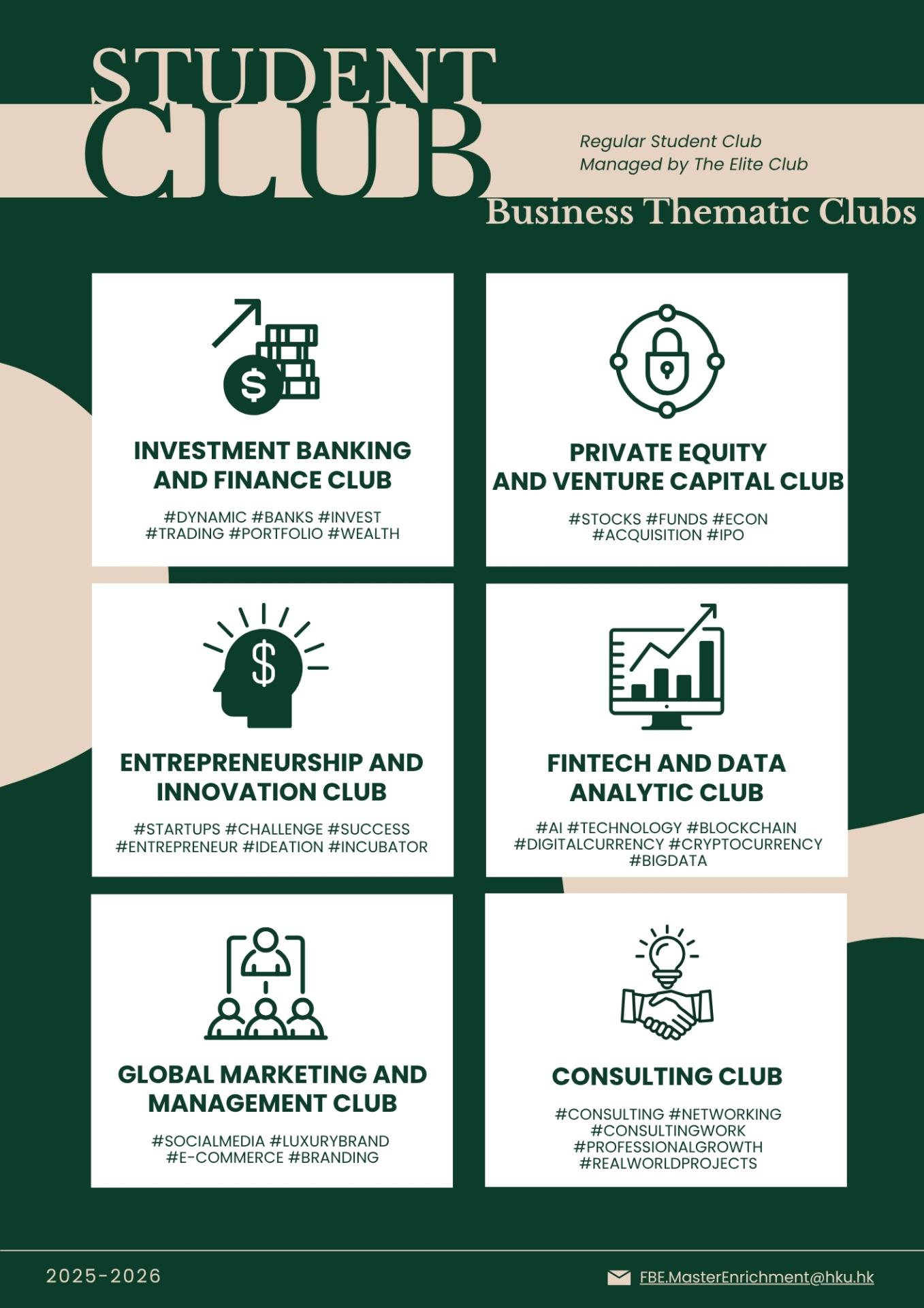 Student Clubs have been set up with the aim of equipping students to develop and present a successful business case through specialized programs. Students will learn to apply highly effective steps that cover the key functional areas of every business: operations, marketing, finance, and human resources. Students will be able to develop and practice their skills in the workplace. The Student Clubs also aim to promote activities and careers in related areas among the Masters’ community. Club officers (The Elite Club) will be offered a series of leadership training to equip them as future leaders.